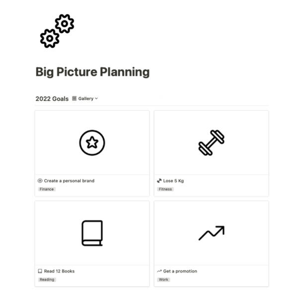 Within the Big Picture Planning section, you will find a 2022 Goal Planner to set your goals and plan their execution; a Projects Planner to reach your goals, linked to both the Goals Tracker and your Task Manager; and a Quarterly Planner, for your quarterly plans and reviews.