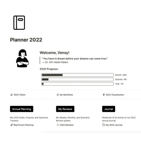 You can buy your copy of the 2022 Planner on Gumroad, and easily duplicate the template on to your Notion workspace. If you have any questions, please reach out!
